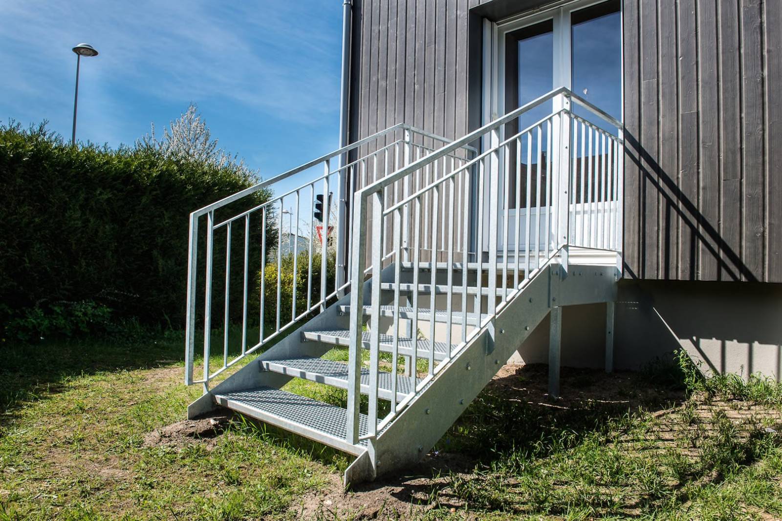 Cet escalier est en acier galvanisé, modulable, équipé de garde corps latéraux, reposants sur 2 limons.